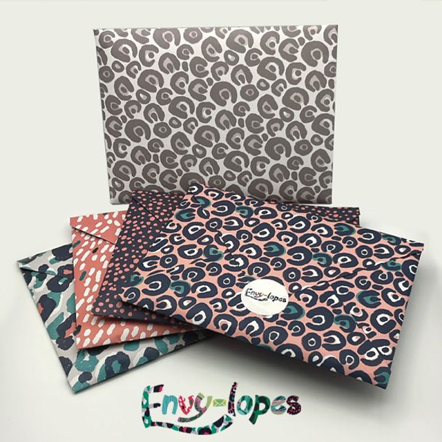 Each pack includes five quirky double-sided patterned envelopes and five sheets of plain coloured writing paper with a lined guide sheet.